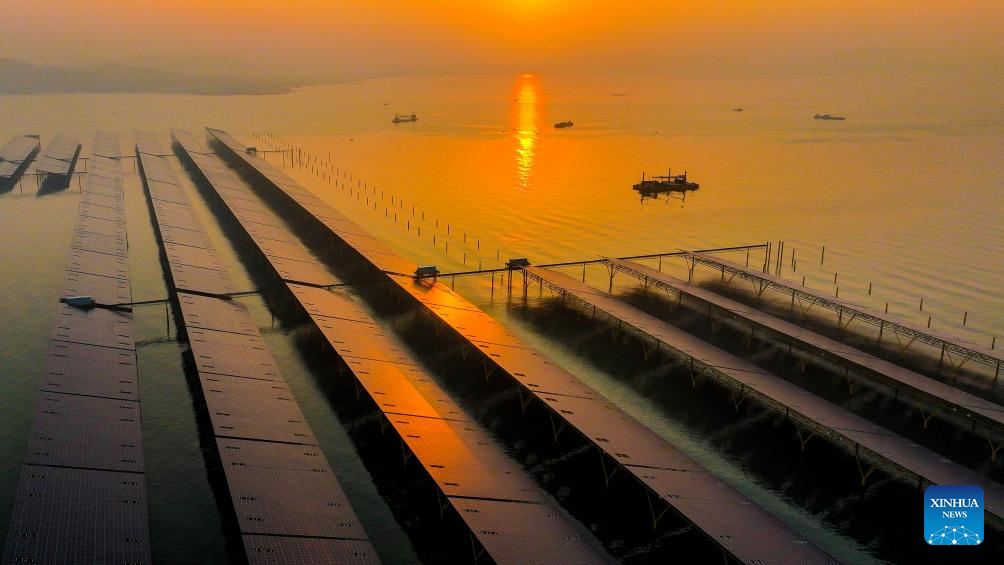 JINAN, 20 noviembre, 2025 (Xinhua) -- Vista aérea tomada con un dron del 16 de noviembre de 2025 de un proyecto de generación de energía fotovoltaica marina, en las aguas de Aoshanwan, en el distrito de Jimo, en la ciudad de Qingdao, en la provincia de Shandong, en el este de China. En 2020, China anunció que se esforzaría por alcanzar el pico de emisiones de dióxido de carbono antes de 2030 y la neutralidad de carbono antes de 2060. (Xinhua/Liang Xiaopeng)