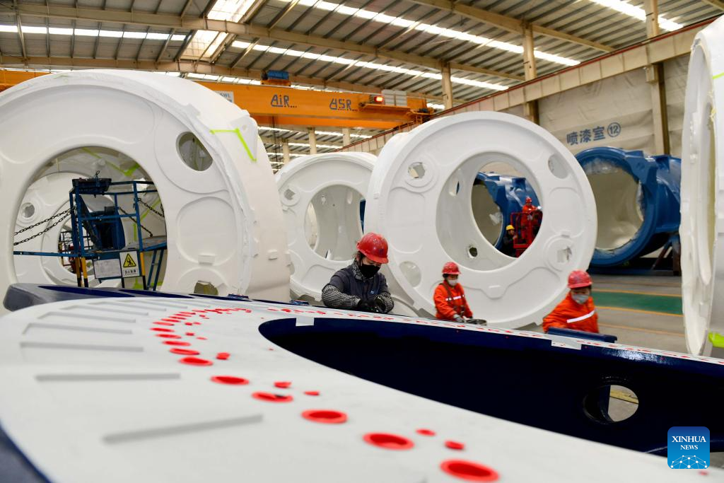 JINAN, 20 noviembre, 2025 (Xinhua) -- Imagen del 19 de noviembre de 2025 de trabajadores pintando un núcleo de un generador de energía eólica en un taller de pintura del parque industrial de fabricación de equipos de energía eólica, en el distrito de Huimin, en la provincia de Shandong, en el este de China. En 2020, China anunció que se esforzaría por alcanzar el pico de emisiones de dióxido de carbono antes de 2030 y la neutralidad de carbono antes de 2060. (Xinhua/Guo Xulei)