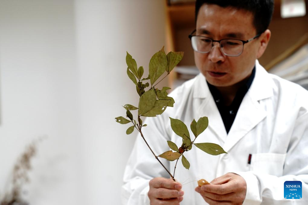 SHANGHAI, 20 noviembre, 2025 (Xinhua) -- Imagen del 19 de noviembre de 2025 de Ge Binjie, curador del Herbario Chenshan de Shanghai, observa un especimen en el Centro Nacional de Recursos de Germoplasma de Plantas Silvestres del Jardín Botánico Chenshan de Shanghai, en Shanghai, en el este de China. Recientemente, el personal confirmó que el número total de semillas viables conservadas en el Centro Nacional de Recursos de Germoplasma de Plantas Silvestres del Jardín Botánico Chenshan de Shanghai ha superado los 100 millones. (Xinhua/Zhang Jiansong)