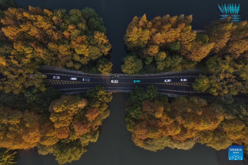 BEIJING, 21 noviembre, 2025 (Xinhua) -- Vista aérea tomada con un dron el 21 de noviembre de 2025 del área escénica del Lago Oeste, en Hangzhou, en la provincia de Zhejiang, en el este de China. (Xinhua/Huang Zongzhi)