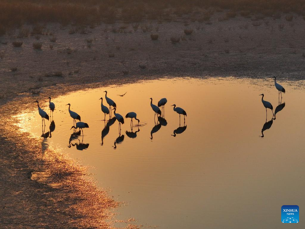BEIJING, 21 noviembre, 2025 (Xinhua) -- Imagen tomada con un dron el 21 de noviembre de 2025 de grullas en un parque de humedales, en Lianyungang, en la provincia de Jiangsu, en el este de China. (Xinhua/Si Wei)