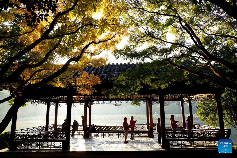 BEIJING, 21 noviembre, 2025 (Xinhua) -- Turistas realizan ejercicio matutino en un pabellón en el área escénica del Lago Oeste, en Hangzhou, en la provincia de Zhejiang, en el este de China, 21 de noviembre de 2025. (Xinhua/Zhuang Yingchang)