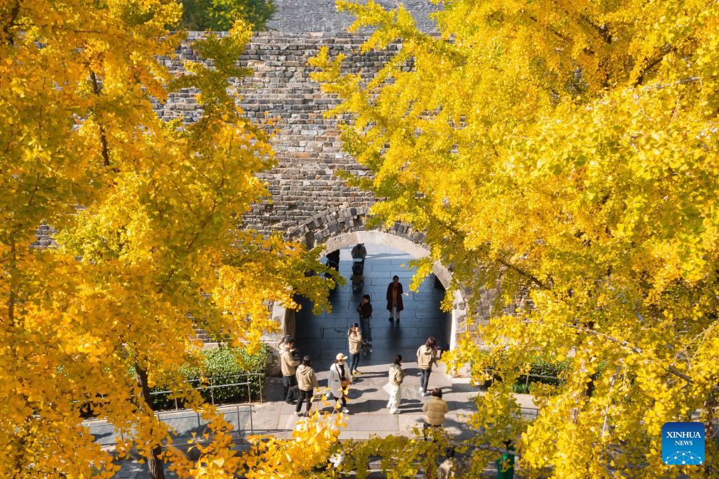 BEIJING, 21 noviembre, 2025 (Xinhua) -- Vista aérea tomada con un dron el 21 de noviembre de 2025 de personas divirtiéndose en una plaza cerca de la puerta de la ciudad de Hanzhongmen, en Nanjing, en la provincia de Jiangsu, en el este de China. (Xinhua/Su Yang)