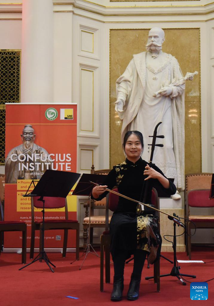 GRAZ, 22 noviembre, 2025 (Xinhua) -- Imagen del 21 de noviembre de 2025 de una actriz tocado el Erhu, un instrumento tradicional chino en un evento para celebrar el 15º aniversario del Instituto Confucio de la Universidad de Graz, en Graz, Austria. (Xinhua/He Canling)