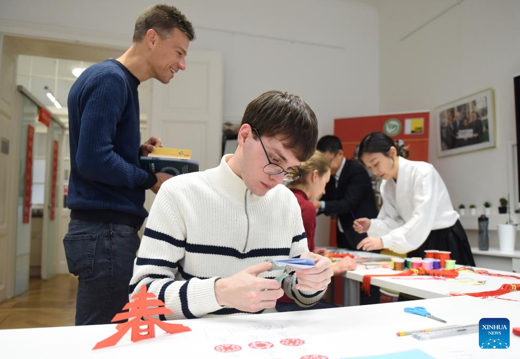 GRAZ, 22 noviembre, 2025 (Xinhua) -- Imagen del 21 de noviembre de 2025 de un invitado probando recorte de papel chino en un evento para celebrar el 15º aniversario del Instituto Confucio de la Universidad de Graz, en Graz, Austria. (Xinhua/He Canling)