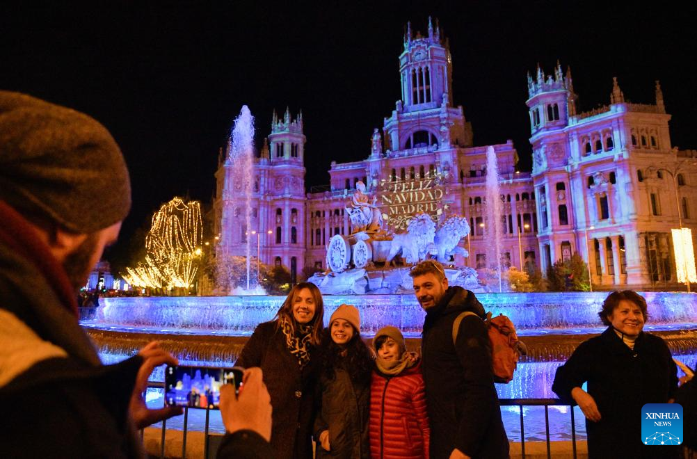 MADRID, 23 noviembre, 2025 (Xinhua) -- Imagen del 22 de noviembre de 2025 de personas posando para una fotografía grupal frente al Palacio de Cibeles, en Madrid, España. Madrid celebró el sábado una ceremonia de encendido navideño con un espectáculo de luces proyectadas. (Xinhua/Cheng Min)