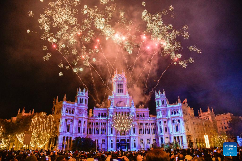 MADRID, 23 noviembre, 2025 (Xinhua) -- Imagen del 22 de noviembre de 2025 de personas disfrutando de un espectáculo de luces proyectadas frente al Palacio de Cibeles, en Madrid, España. Madrid celebró el sábado una ceremonia de encendido navideño con un espectáculo de luces proyectadas. (Xinhua/Cheng Min)