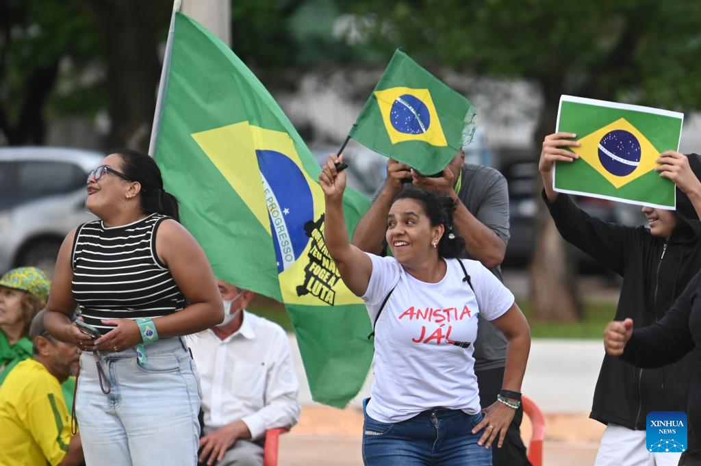 Simpatizantes del expresidente brasileño, Jair Bolsonaro, se manifiestan frente a la Superintendencia de la Policía Federal, donde se encuentra detenido, en Brasilia, Brasil, el 25 de noviembre de 2025. El Supremo Tribunal Federal de Brasil declaró el martes que el proceso del expresidente Jair Bolsonaro (2019-2022) por tentativa de golpe de Estado es cosa juzgada, por lo que puede iniciar el cumplimiento de sus penas en prisión. (Xinhua/Lucio Tavora)