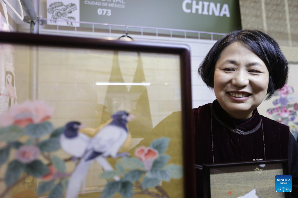Imagen del 28 de noviembre de 2025 de la artista china, Chen Wen, maestra especializada en la técnica ancestral china del kesi o seda corta, mostrando piezas de su creación exhibidas en el estand de China durante el Encuentro de Arte Textil Mexicano en el Complejo Cultural Los Pinos, en la Ciudad de México, capital de México. Durante cuatro días, el Complejo Cultural Los Pinos de la Ciudad de México acogió el Encuentro de Arte Textil Mexicano, donde artesanos chinos exhibieron impresionantes tapices y bordados de seda cortada, conocidos como "kesi", dejando una profunda impresión en el público local. Como parte de las actividades paralelas, Chen Wen impartió el foro "La ruta de la seda a través del tiempo". (Xinhua/Francisco Cañedo)