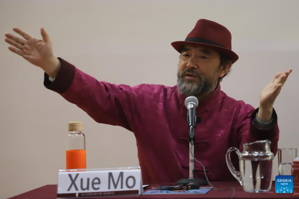 Imagen del 28 de noviembre de 2025 del escritor chino, Xue Mo, hablando durante una conferencia en el Colegio de México, en la Ciudad de México, capital de México. Recuperar los valores ancestrales como base para fortalecer la convivencia entre comunidades del mundo y avanzar hacia un destino común es indispensable para que las sociedades coexistan y prosperen, consideró Xue Mo. (Xinhua/Daniel Augusto)