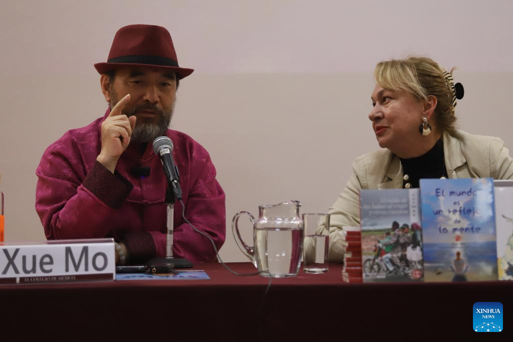 Imagen del 28 de noviembre de 2025 del escritor chino, Xue Mo (i), hablando durante una conferencia en el Colegio de México, en la Ciudad de México, capital de México. Recuperar los valores ancestrales como base para fortalecer la convivencia entre comunidades del mundo y avanzar hacia un destino común es indispensable para que las sociedades coexistan y prosperen, consideró Xue Mo. (Xinhua/Daniel Augusto)