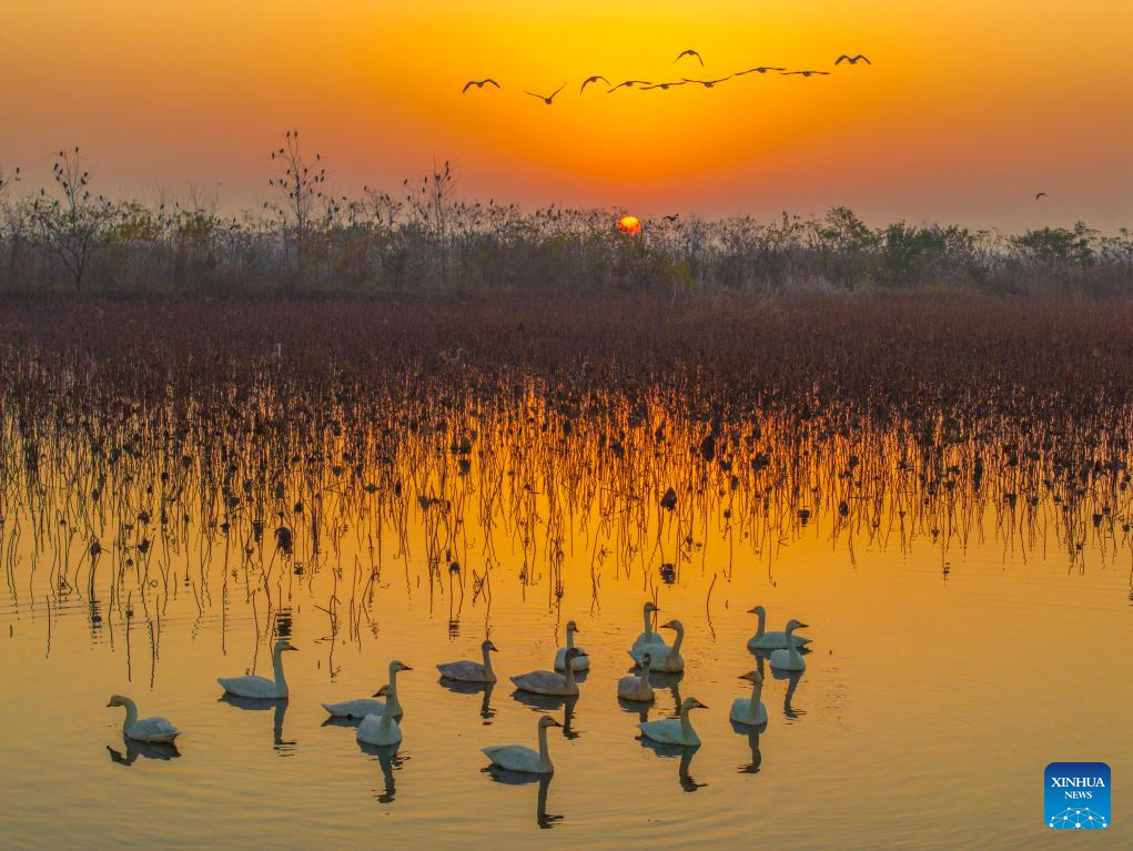 BEIJING, 30 noviembre, 2025 (Xinhua) -- Una bandada de aves descansan en el parque del humedal, en Zhangye, en la provincia de Gansu, en el noroeste de China, el 30 de noviembre de 2025. (Xinhua/Chen Li)