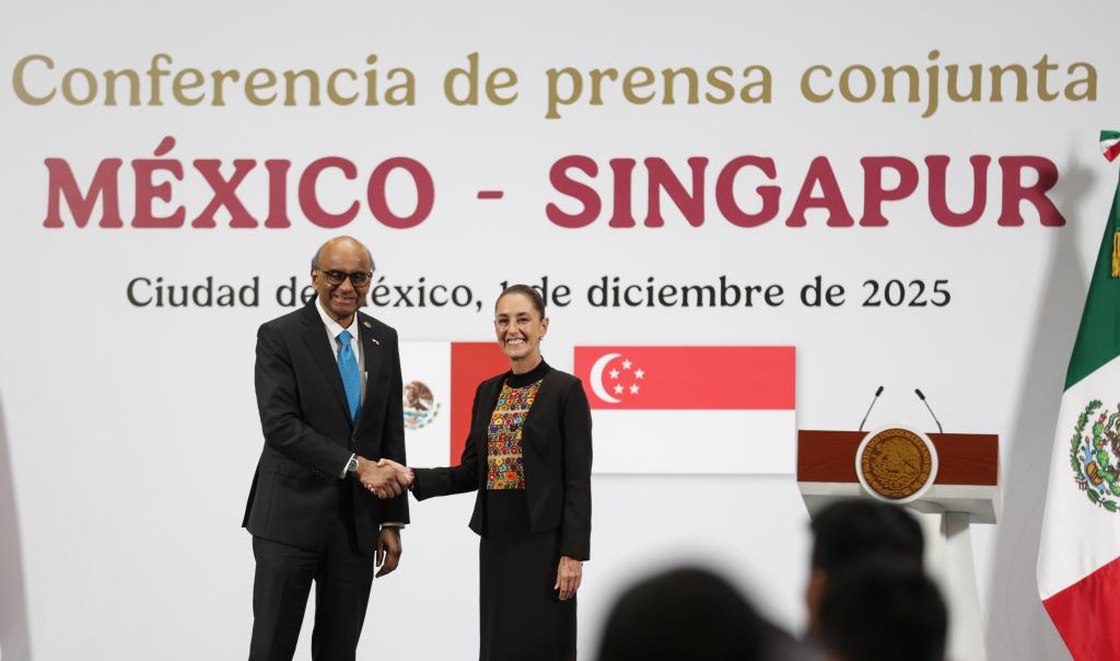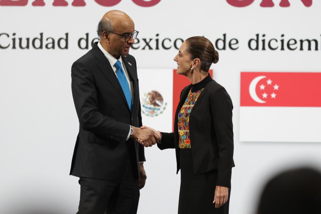 CIUDAD DE MEXICO, 1 diciembre, 2025 (Xinhua) -- La presidenta mexicana, Claudia Sheinbaum (d), estrecha la mano del presidente de Singapur, Tharman Shanmugaratnam (i), durante una conferencia de prensa conjunta, en Palacio Nacional, en la Ciudad de México, capital de México, el 1 de diciembre de 2025. (Xinhua/Francisco Cañedo)