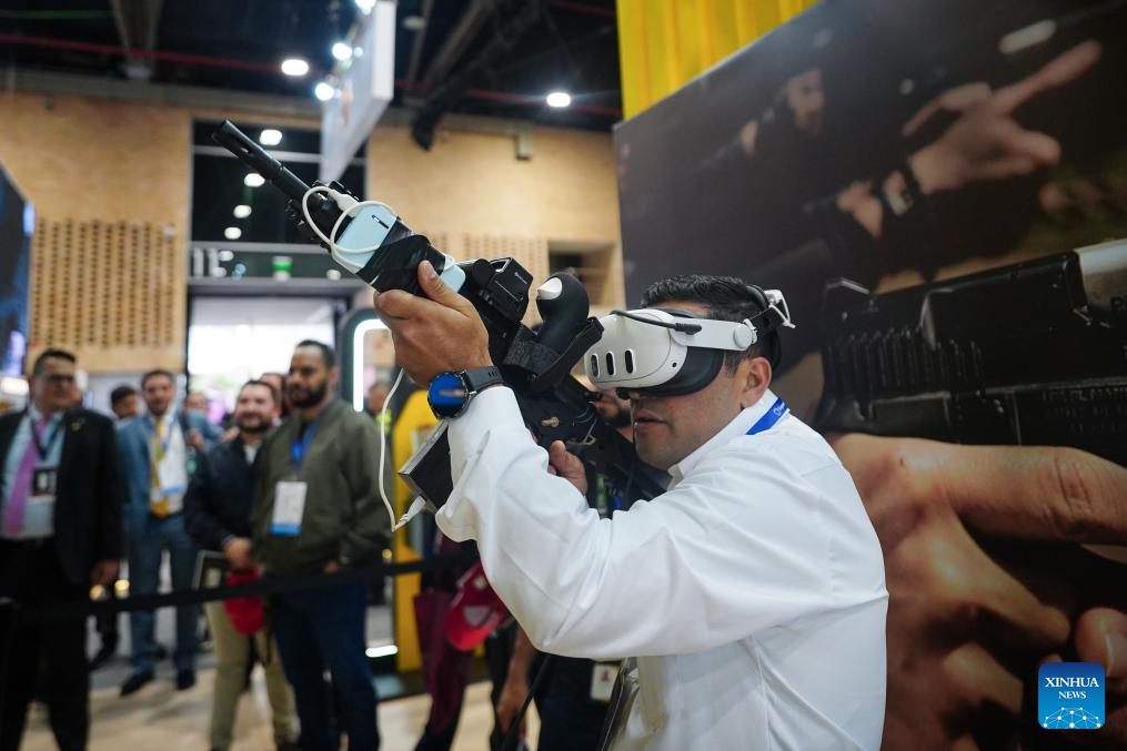 Imagen del 1 de diciembre de 2025 de un hombre probando un simulador durante el primer día de Expodefensa 2025 en el recinto ferial Corferias, en Bogotá, capital de Colombia. Con la presencia del ministro de Defensa de Colombia, Pedro Sánchez, abrió sus puertas Expodefensa 2025, una feria internacional que reúne a empresas líderes del sector de la seguridad y la defensa a nivel mundial. La edición de este año cuenta con pabellones de 28 países en el gran salón del recinto ferial Corferias de Bogotá. (Xinhua/Andrés Moreno)