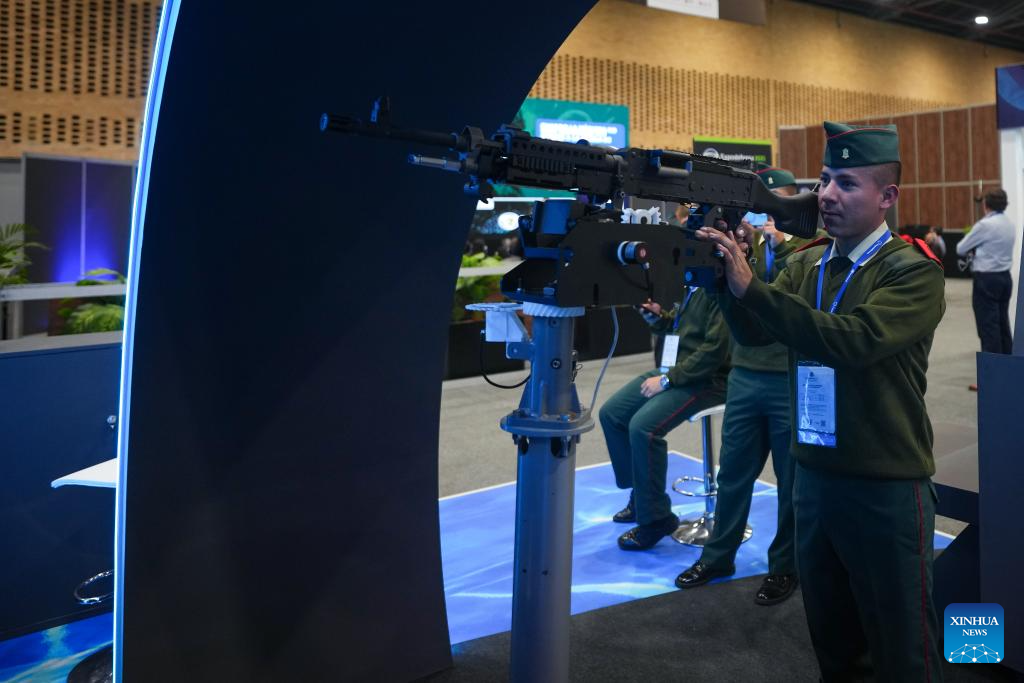 Imagen del 1 de diciembre de 2025 de un elemento de las Fuerzas Armadas colombianas probando un simulador durante el primer día de Expodefensa 2025 en el recinto ferial Corferias, en Bogotá, capital de Colombia. Con la presencia del ministro de Defensa de Colombia, Pedro Sánchez, abrió sus puertas Expodefensa 2025, una feria internacional que reúne a empresas líderes del sector de la seguridad y la defensa a nivel mundial. La edición de este año cuenta con pabellones de 28 países en el gran salón del recinto ferial Corferias de Bogotá. (Xinhua/Andrés Moreno)