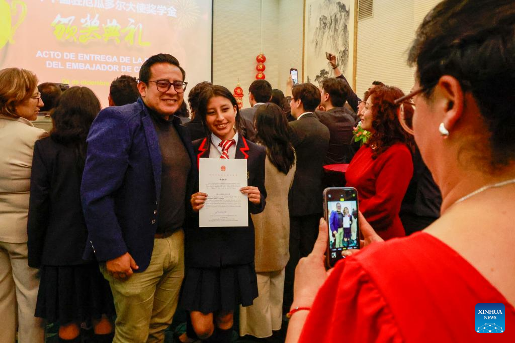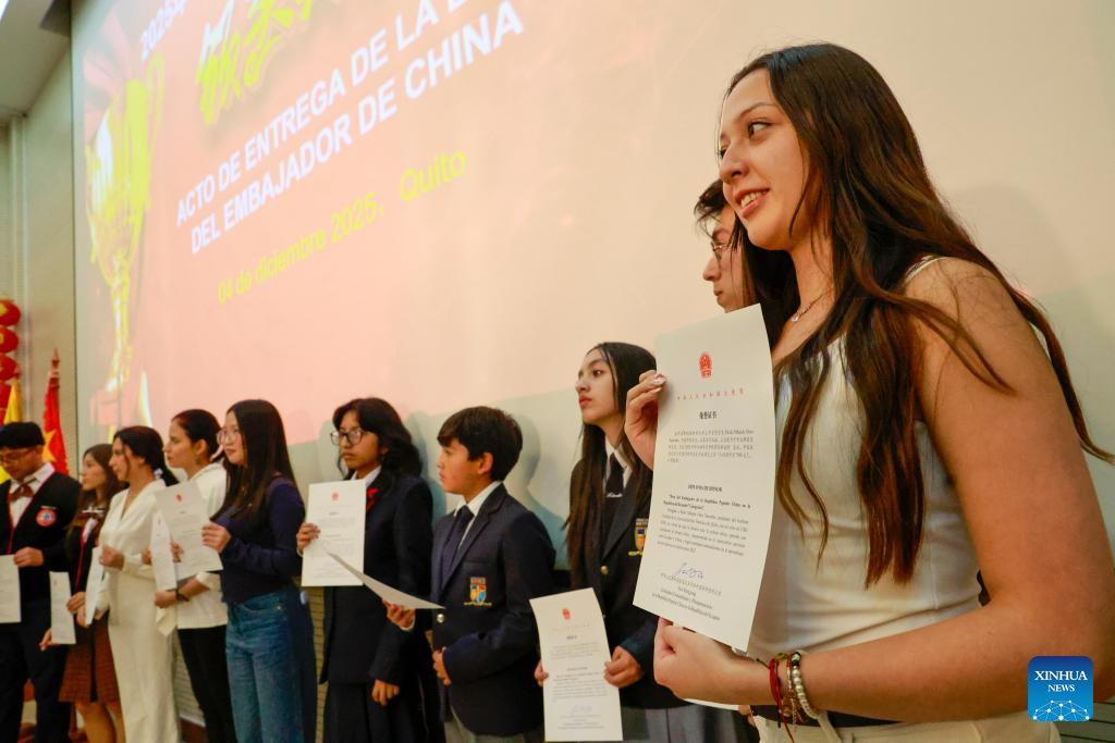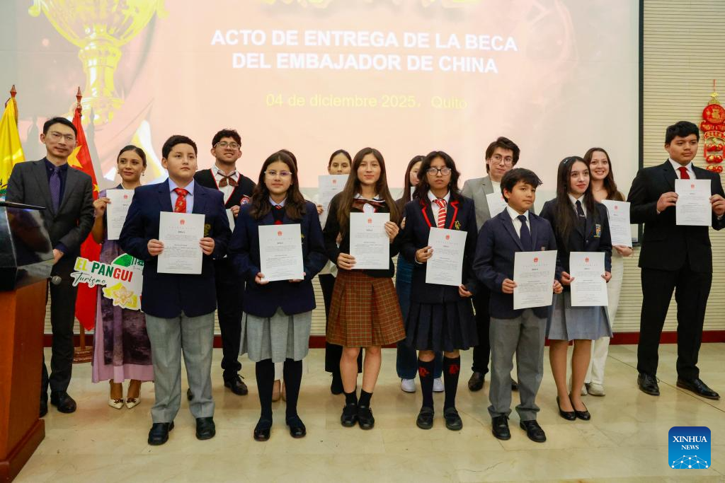 QUITO, 5 dic (Xinhua) -- Un grupo de 42 estudiantes ecuatorianos destacados en el aprendizaje del idioma chino recibió la noche del jueves la "Beca Embajador chino 2025" durante una ceremonia especial en la que se destacó la creciente profundización de los intercambios y la cooperación cultural y educativa entre ambos países.