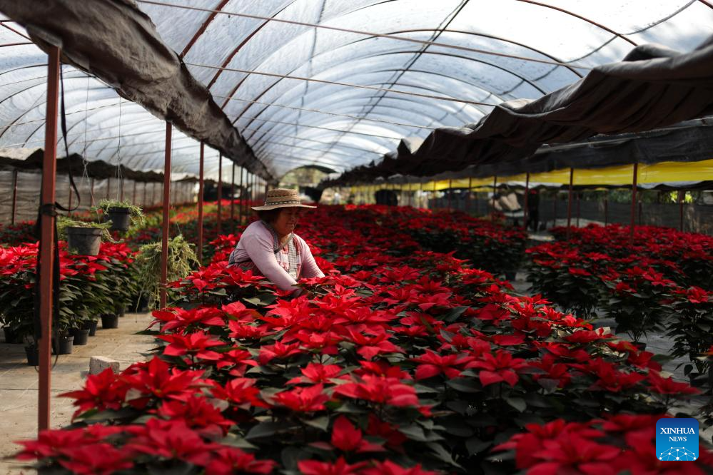 CIUDAD DE MEXICO, 6 diciembre, 2025 (Xinhua) -- Imagen del 5 de diciembre de 2025 de una mujer acomodando flores de Nochebuena, en la Ciudad de México, capital de México. (Xinhua/Francisco Cañedo)