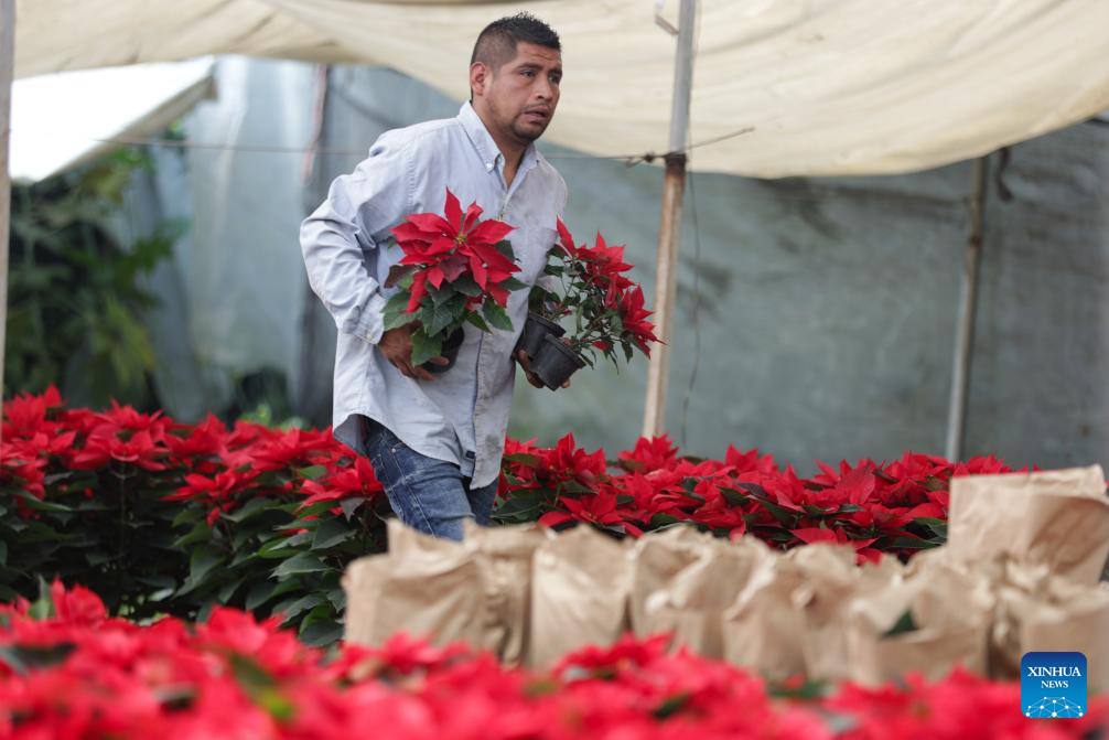 CIUDAD DE MEXICO, 6 diciembre, 2025 (Xinhua) -- Imagen del 5 de diciembre de 2025 de un hombre transportando flores de Nochebuena, en la Ciudad de México, capital de México. (Xinhua/Francisco Cañedo)