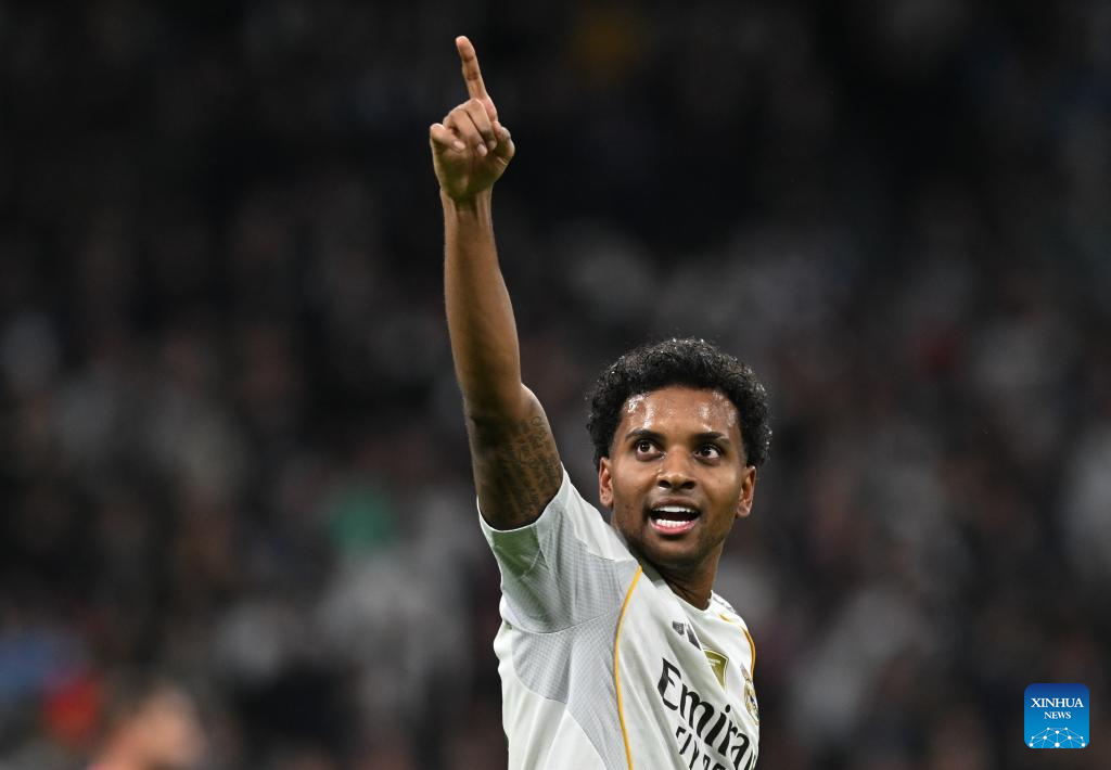 MADRID, 11 diciembre, 2025 (Xinhua) -- Imagen del 10 de diciembre de 2025 de Rodrygo, de Real Madrid, festejando su anotación durante el partido de fútbol de la Liga de Campeones de la UEFA, entre Real Madrid y Manchester City, en Madrid, España. (Xinhua/Cheng Min)