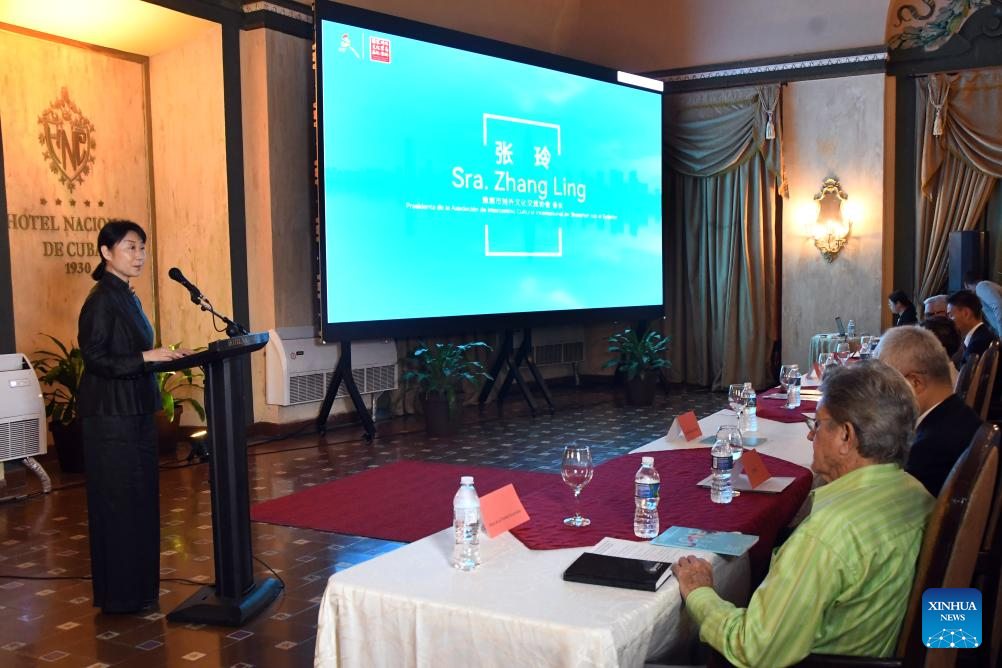 Imagen del 19 de diciembre de 2025 de la presidenta de la Asociación de Intercambio Cultural de Shenzhen con el Exterior, Zhang Ling (i), pronunciando un discurso en un encuentro entre representantes de China y Cuba, en La Habana, capital de Cuba. Cuba participará en la XXII Feria Internacional de Industrias Culturales de China, a celebrarse en mayo del próximo año en la ciudad china de Shenzhen, por lo que una delegación de la nación asiática llegó a La Habana para promover las potencialidades del evento. (Xinhua/Joaquín Hernández)