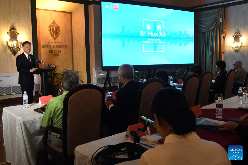 Imagen del 19 de diciembre de 2025 del embajador chino en Cuba, Hua Xin (i-atrás), pronunciando un discurso en un encuentro entre representantes de China y Cuba, en La Habana, capital de Cuba. Cuba participará en la XXII Feria Internacional de Industrias Culturales de China, a celebrarse en mayo del próximo año en la ciudad china de Shenzhen, por lo que una delegación de la nación asiática llegó a La Habana para promover las potencialidades del evento. (Xinhua/Joaquín Hernández)