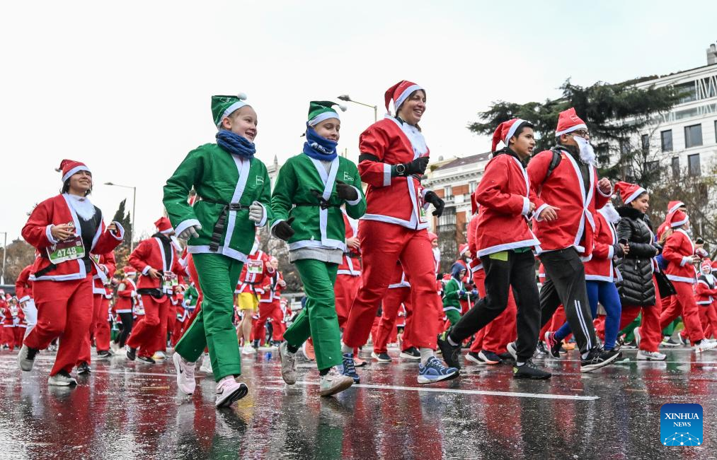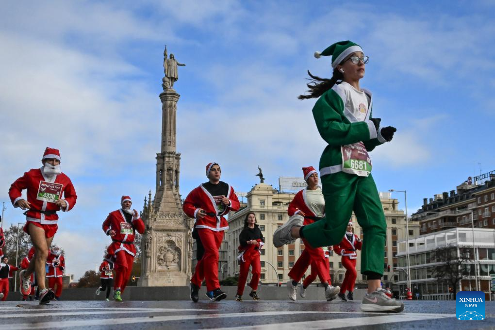 MADRID, 22 diciembre, 2025 (Xinhua) -- Imagen del 21 de diciembre de 2025 de corredores disfrazados como Santa Claus asistiendo a un evento de carreras con temática navideña, en Madrid, España. (Xinhua/Cheng Min)