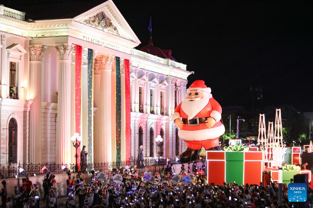 SAN SALVADOR, 22 diciembre, 2025 (Xinhua) -- Imagen del 21 de diciembre de 2025 de personas observando un globo gigante con la figura de Santa Claus frente al Palacio Nacional durante la segunda edición del Desfile de Globos Gigantes en el Centro Histórico, en el departamento de San Salvador, capital de El Salvador. (Xinhua/Alexander Peña)