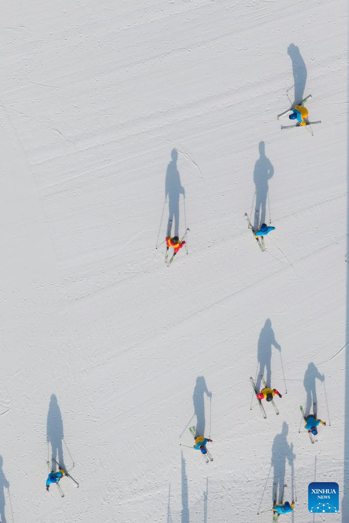 SHUOZHOU, 8 enero, 2026 (Xinhua) -- Vista aérea tomada con un dron el 7 de enero de 2026 de turistas esquiando en la estación internacional de esquí de Guangwu, en el distrito de Shanyin de Shuozhou, en la provincia de Shanxi, en el norte de China. El distrito de Shanyin ha estado aprovechando su ventaja geográfica para desarrollar el turismo temático de hielo y nieve, que ahora es un nuevo motor para la economía local. (Xinhua/Yang Chenguang)