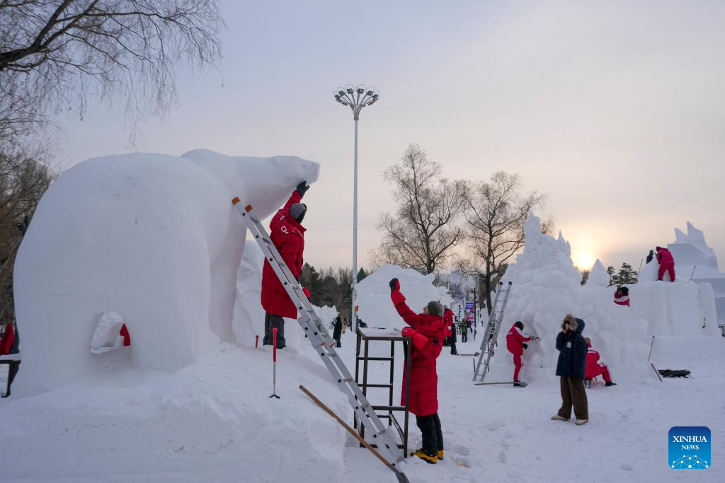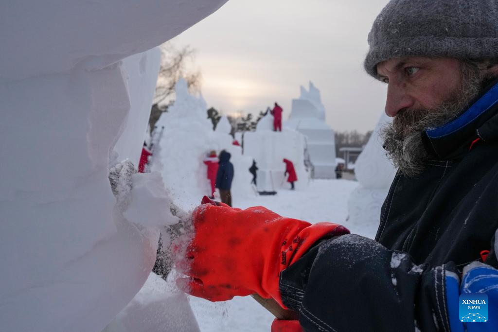 HARBIN, 8 enero, 2026 (Xinhua) -- Un concursante trabaja en una escultura de nieve en la Exposición Internacional de Arte de Esculturas de Nieve de la Isla del Sol, en Harbin, en la provincia de Heilongjiang, en el noreste de China, el 8 de enero de 2026. El 28 concurso internacional de esculturas de nieve de Harbin comenzó aquí el martes, atrayendo 25 equipos de escultores de nieve de 13 países. (Xinhua/Wang Jianwei)