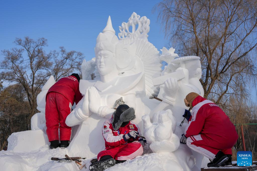HARBIN, 8 enero, 2026 (Xinhua) -- Concursantes trabajan en una escultura de nieve en la Exposición Internacional de Arte de Esculturas de Nieve de la Isla del Sol, en Harbin, en la provincia de Heilongjiang, en el noreste de China, el 8 de enero de 2026. El 28 concurso internacional de esculturas de nieve de Harbin comenzó aquí el martes, atrayendo 25 equipos de escultores de nieve de 13 países. (Xinhua/Wang Jianwei)