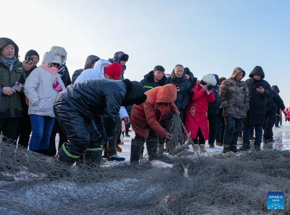 SONGYUAN, 8 enero, 2026 (Xinhua) -- Imagen del 7 de enero de 2026 de pescadores sacando la red del lago Chagan cubierto de hielo, en Songyuan, en la provincia de Jilin, en el noreste de China. El 24 Festival de Turismo Cultural de Pesca y Caza en Hielo y Nieve del Lago Chagan fue inaugurado aquí el jueves. Las técnicas de pesca tradicionales se realizan en el lago, como el cincelado manual del hielo, los cabrestantes tirados por caballos y el arrastre de redes bajo el lago cubierto de hielo. La pesca en el hielo del lago Chagan, un patrimonio cultural inmaterial nacional, se ha convertido en un símbolo significativo de la cultura del hielo y nieve en el noreste de China. (Xinhua/Yan Linyun)