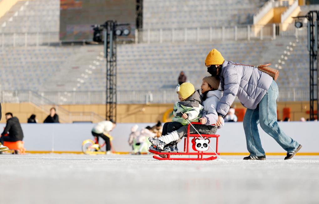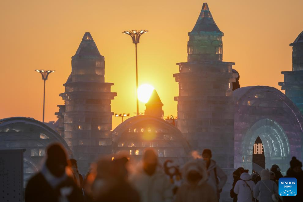 HARBIN, 18 enero, 2026 (Xinhua) -- Turistas se divierten en el atardecer en el Mundo de Hielo y Nieve de Harbin, el parque temático de Hielo y Nieve más grande del mundo, en Harbin, en la provincia de Heilongjiang, en el noreste de China, el 18 de enero de 2026. (Xinhua/Zhang Shu)