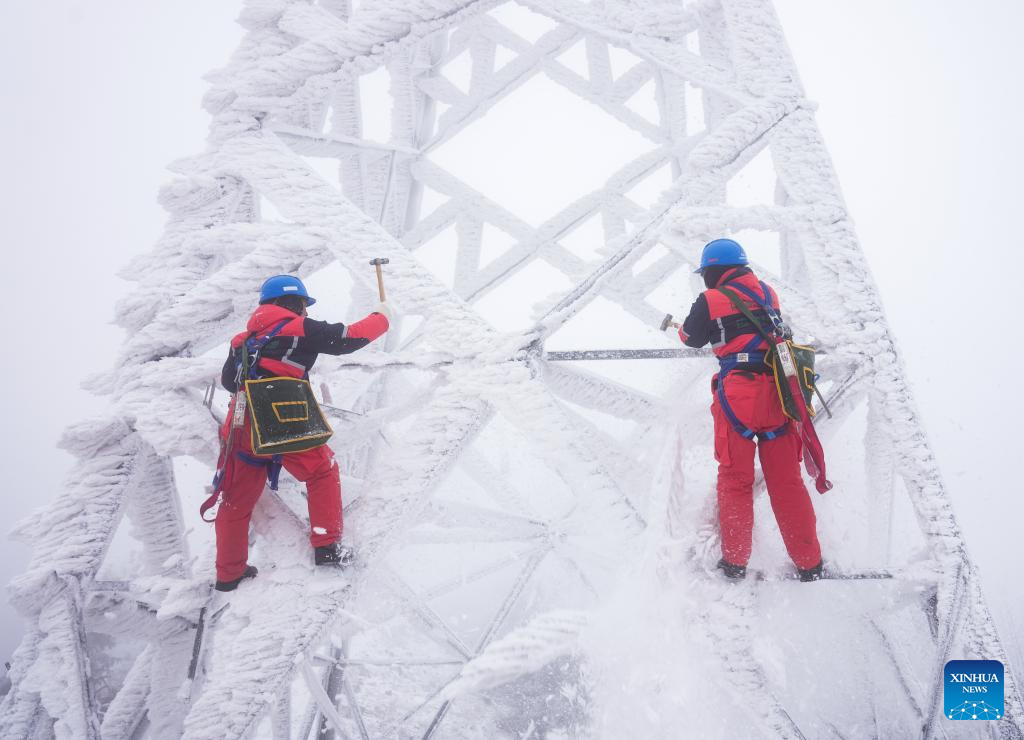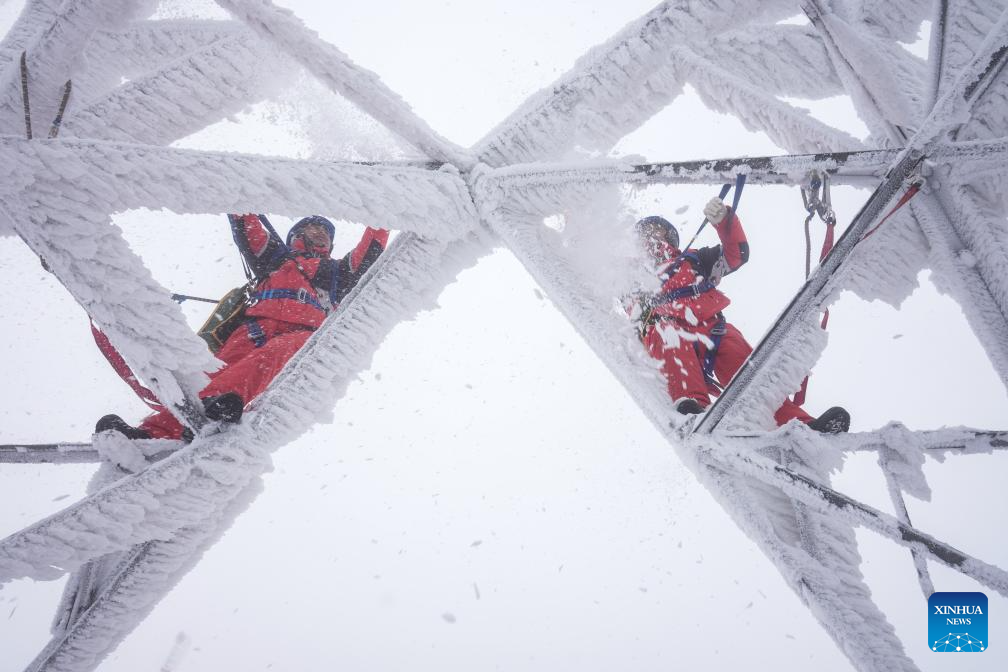Trabajadores de mantenimiento eléctrico garantizan el funcionamiento estable de la red eléctrica en medio de severa formación de hielo