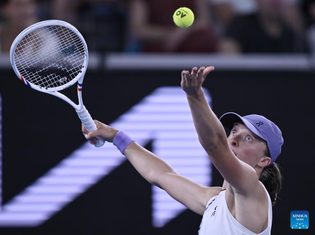 MELBOURNE, 24 enero, 2026 (Xinhua) -- Iga Swiatek sirve la pelota durante el partido de tercera ronda de individuales femeninos entre Iga Swiatek, de Polonia, y Anna Kalinskaya, de Rusia, en el torneo de tenis Abierto de Australia, en Melbourne, Australia, el 24 de enero de 2026. (Xinhua/Wang Shen)