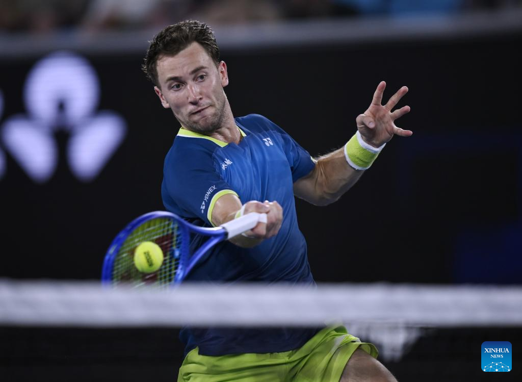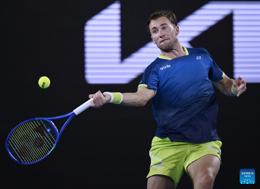 MELBOURNE, 24 enero, 2026 (Xinhua) -- Casper Ruud devuelve la pelota durante el partido de tercera ronda de individuales masculinos entre Marin Cilic, de Croacia, y Casper Ruud, de Noruega, en el torneo de tenis Abierto de Australia, en Melbourne, Australia, el 24 de enero de 2026. (Xinhua/Wang Shen)
