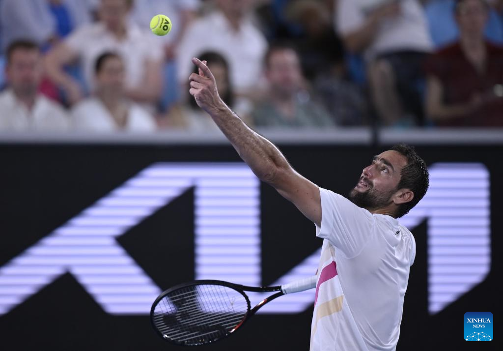 MELBOURNE, 24 enero, 2026 (Xinhua) -- Marin Cilic sirve la pelota durante el partido de tercera ronda de individuales masculinos entre Marin Cilic, de Croacia, y Casper Ruud, de Noruega, en el torneo de tenis Abierto de Australia, en Melbourne, Australia, el 24 de enero de 2026. (Xinhua/Wang Shen)