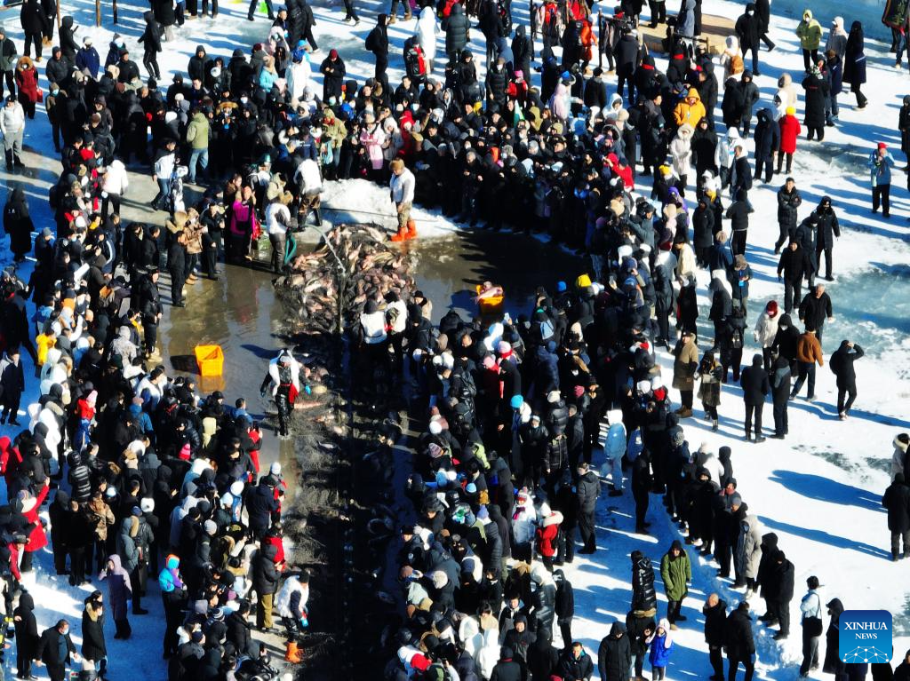 SHENYANG, 24 enero, 2026 (Xinhua) -- Trabajadores transfieren pescado recién capturado en el lago Wolong, en el distrito de Kangping de Shenyang, en la provincia de Liaoning, en el noreste de China, el 24 de enero de 2026. Un evento de pesca de invierno comenzó aquí el sábado, con presentaciones, gastronomía a base de pescado e instalaciones recreativas de hielo y nieve. (Xinhua/Han He)