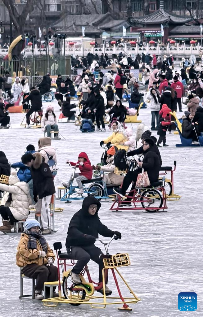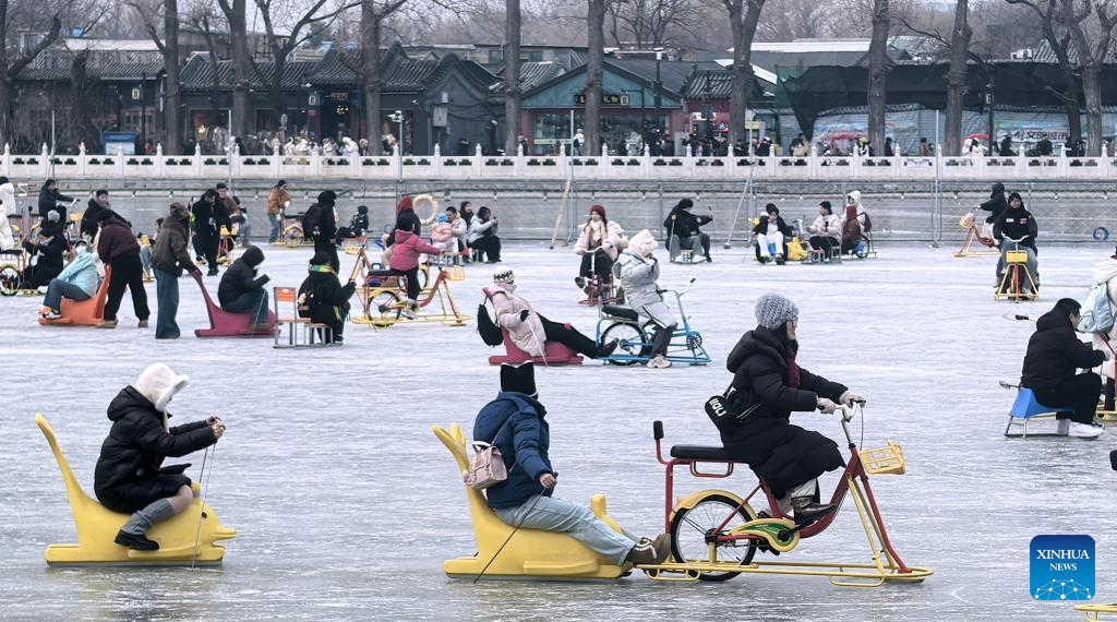 BEIJING, 25 enero, 2026 (Xinhua) -- Personas juegan en el congelado lago Shichahai, en Beijing, capital de China, el 25 de enero de 2026. (Xinhua/Li Xin)