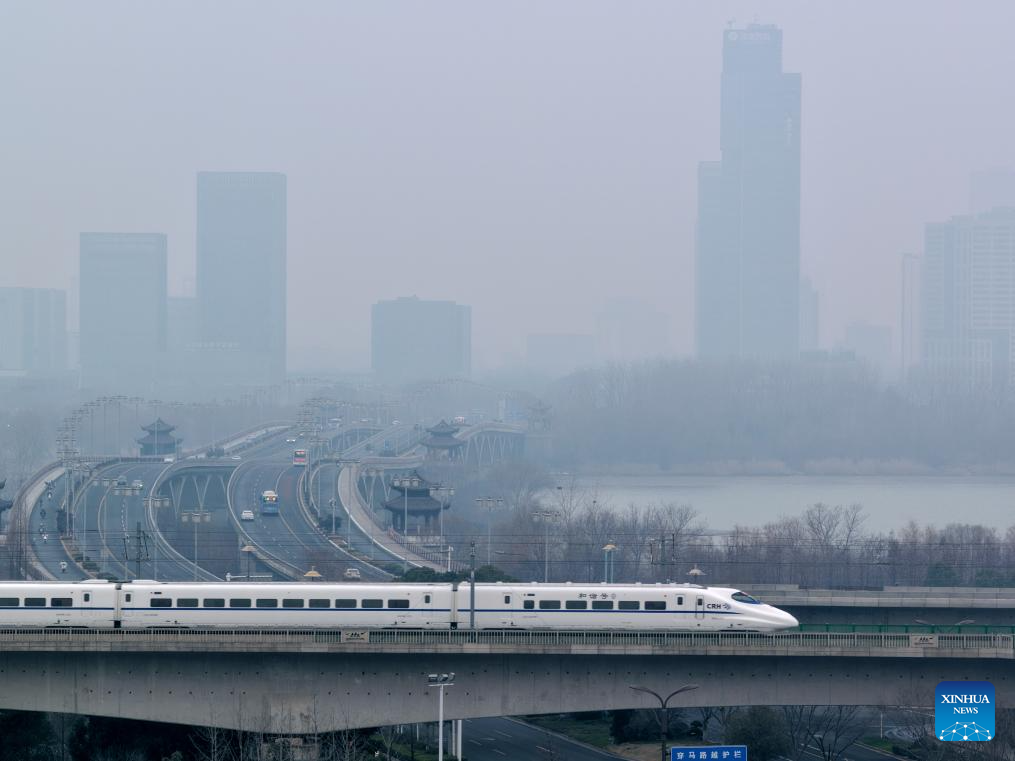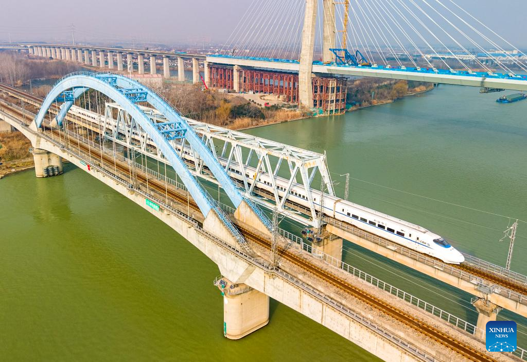 BEIJING, 25 enero, 2026 (Xinhua) -- Imagen tomada con un dron el 25 de enero de 2026 de un tren bala circulando, en la ciudad de Yangzhou, en la provincia de Jiangsu, en el este de China. Un nuevo horario de tren tomará efecto en China desde el 26 de enero de 2026. (Xinhua/Meng Delong)