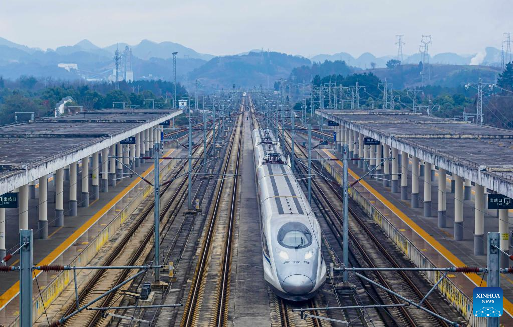 BEIJING, 25 enero, 2026 (Xinhua) -- Un tren bala circula frente a la Estación del Ferrocarril de Qianxi, en Qianxi, en la provincia de Guizhou, en el suroeste de China, el 25 de enero de 2026. Un nuevo horario de tren tomará efecto en China desde el 26 de enero de 2026. (Xinhua/Fan Hui)