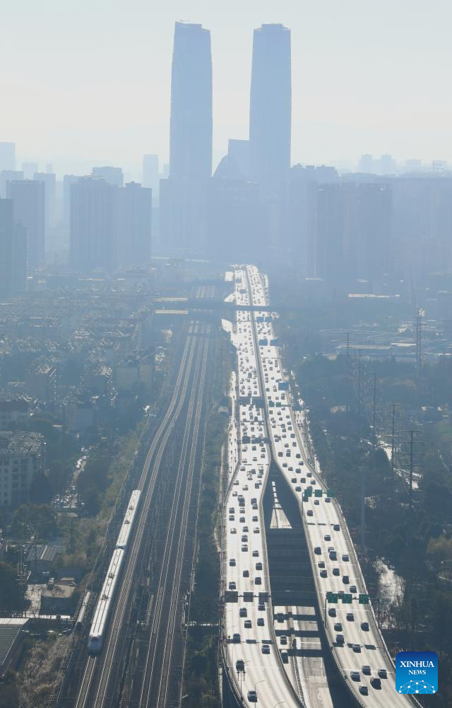 BEIJING, 25 enero, 2026 (Xinhua) -- Un tren bala (i-abajo) circula, en el área urbana de la ciudad de Kunming, en la provincia de Yunnan, en el suroeste de China, el 25 de enero de 2026. Un nuevo horario de tren tomará efecto en China desde el 26 de enero de 2026. (Xinhua/Zheng Yi)