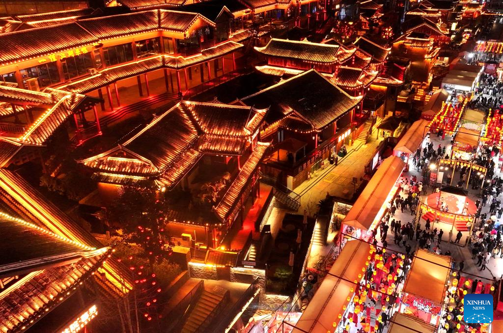 BEIJING, 19 febrero, 2026 (Xinhua) -- Vista aérea tomada con un dron el 17 de febrero de 2026 de turistas paseando por una calle de bocadillos en el distrito de Xuan'en, en la provincia de Hubei, en el centro de China. Durante la Fiesta de la Primavera, las decoraciones de linternas a través del país crearon un alegre ambiente para la celebración. (Xinhua/Song Wen)