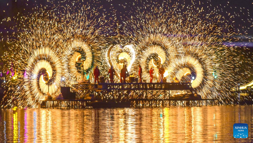 BEIJING, 19 febrero, 2026 (Xinhua) -- Imagen del 17 de febrero de 2026 de un espectáculo de fuegos artificiales de hierro fundido presentado sobre el agua en un jardín botánico, en la ciudad de Luoyang, en la provincia de Henan, en el centro de China. Durante la Fiesta de la Primavera, las decoraciones de linternas a través del país crearon un alegre ambiente para la celebración. (Xinhua/Huang Zhengwei)