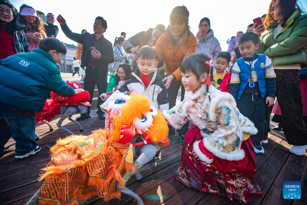 BEIJING, 19 febrero, 2026 (Xinhua) -- Imagen del 18 de febrero de 2026 de una presentación de la danza de león llevada a cabo en el distrito de Jinhu de Huaian, en la provincia de Jiangsu, en el este de China. Durante la Fiesta de la Primavera, varias actividades folclóricas y presentaciones se llevan a cabo a través de China. (Xinhua/Chen Yibao)