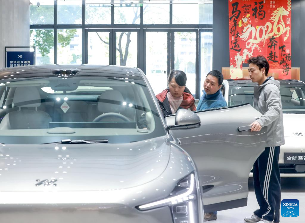 BEIJING, 21 febrero, 2026 (Xinhua) -- Clientes observan un vehículo de nueva energía en un centro comercial, en Wuhan, en la provincia de Hubei, en el centro de China, el 21 de febrero de 2026. Una serie de programas y políticas de estímulo al consumo han contribuido a impulsar el gasto de los consumidores durante las vacaciones de la Fiesta de la Primavera de China, con los electrodomésticos, los vehículos y la electrónica de consumo entre las categorías más vendidas. (Xinhua/Zhao Jun)