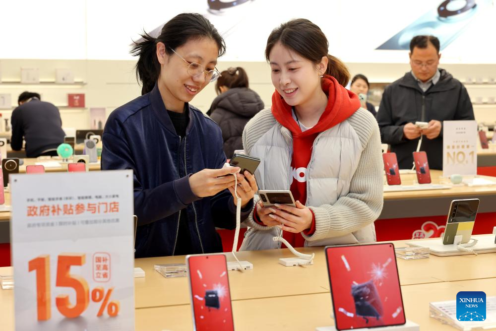 BEIJING, 21 febrero, 2026 (Xinhua) -- Clientes eligen teléfonos móviles en una tienda de electrónica de consumo, en Zaozhuang, en la provincia de Shandong, en el este de China, el 21 de febrero de 2026. Una serie de programas y políticas de estímulo al consumo han contribuido a impulsar el gasto de los consumidores durante las vacaciones de la Fiesta de la Primavera de China, con los electrodomésticos, los vehículos y la electrónica de consumo entre las categorías más vendidas. (Xinhua/Sun Zhongzhe)