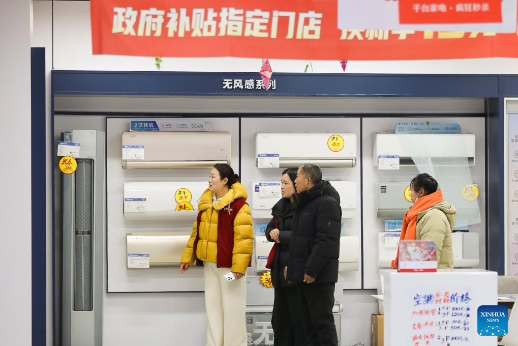 BEIJING, 21 febrero, 2026 (Xinhua) -- Clientes eligen electrodomésticos en un centro comercial, en Haian, en la provincia de Jiangsu, en el este de China, el 21 de febrero de 2026. Una serie de programas y políticas de estímulo al consumo han contribuido a impulsar el gasto de los consumidores durante las vacaciones de la Fiesta de la Primavera de China, con los electrodomésticos, los vehículos y la electrónica de consumo entre las categorías más vendidas. (Xinhua/Gu Binbin)