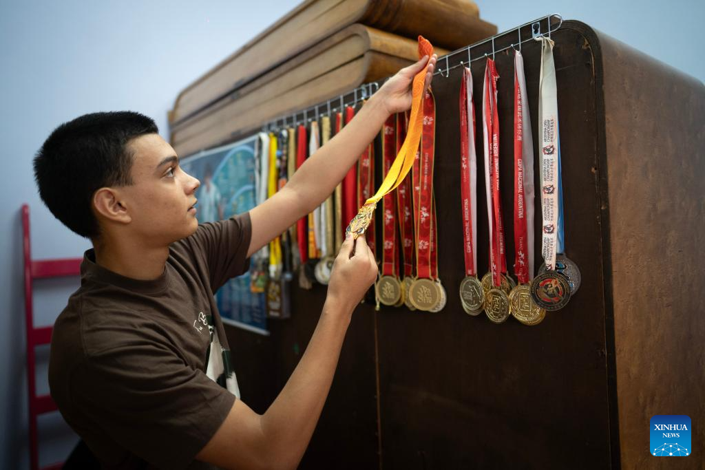 BUENOS AIRES, 18 febrero, 2026 (Xinhua) -- Imagen del 4 de febrero de 2026 de Marcos González, un joven de 14 años de edad y practicante de wushu, ordenando las medallas obtenidas en torneos, en su habitación, en la ciudad de Buenos Aires, capital de Argentina. La milenaria cultura china y sus múltiples manifestaciones, como la Fiesta de la Primavera, el arte, la música, la danza y el deporte marcial, atrae y enamora a los jóvenes de Argentina, que se suman con entusiasmo, respeto y admiración a la práctica de distintas disciplinas, costumbres y celebraciones originarias del país asiático. (Xinhua/Martín Zabala)