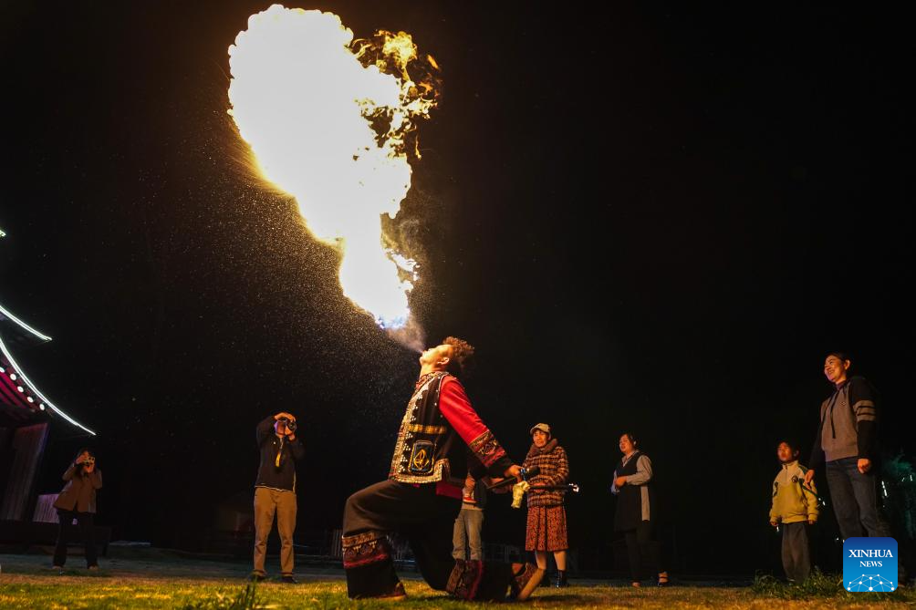 SONGMING, 27 marzo, 2026 (Xinhua) -- Imagen del 26 de marzo de 2026 de un actor realizando una presentación de escupir fuego, en la comunidad de Dongcun, en el distrito de Songming, en la provincia de Yunnan, en el suroeste de China. La comunidad de Dongcun fue alguna vez una aldea empobrecida a nivel provincial, que lidiaba con desafíos como la subutilización de recursos y las dificultades en el desarrollo industrial. En los últimos años, la comunidad ha revitalizado casas rurales abandonadas, edificios escolares y otros espacios para desarrollar el turismo de estancia. (Xinhua/Peng Yikai)