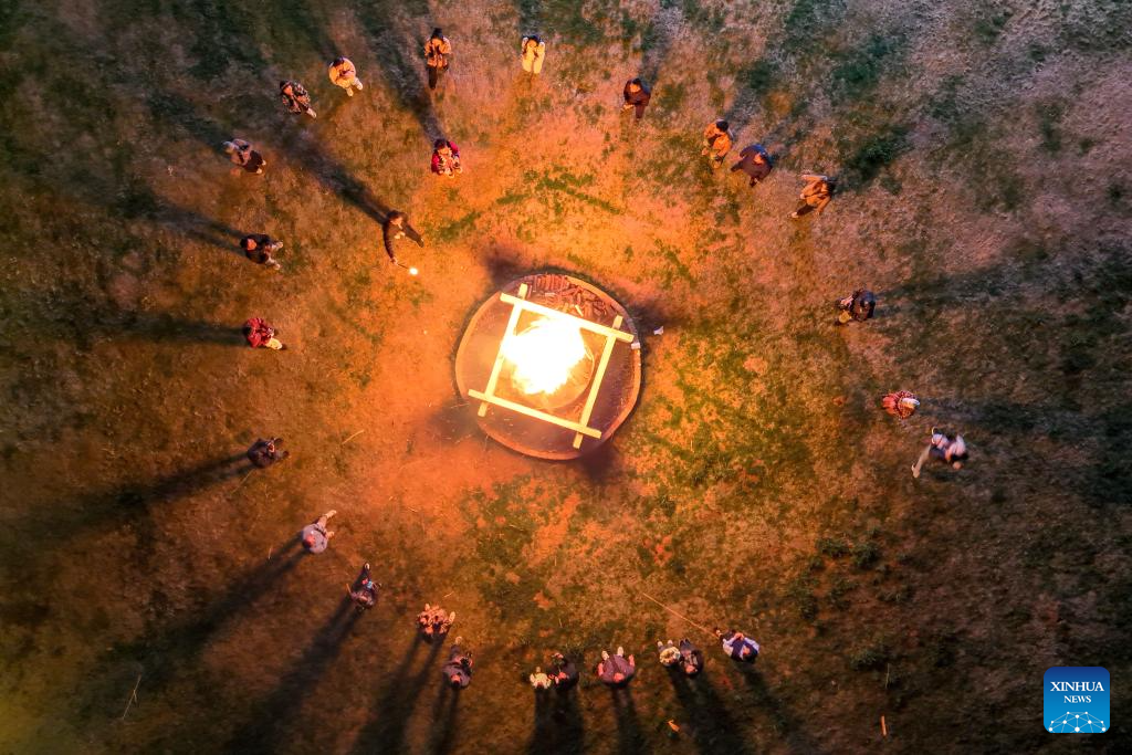 SONGMING, 27 marzo, 2026 (Xinhua) -- Vista aérea tomada con un dron el 26 de marzo de 2026 de personas participando en una fogata festiva, en la comunidad de Dongcun, en el distrito de Songming, en la provincia de Yunnan, en el suroeste de China. La comunidad de Dongcun fue alguna vez una aldea empobrecida a nivel provincial, que lidiaba con desafíos como la subutilización de recursos y las dificultades en el desarrollo industrial. En los últimos años, la comunidad ha revitalizado casas rurales abandonadas, edificios escolares y otros espacios para desarrollar el turismo de estancia. (Xinhua/Peng Yikai)